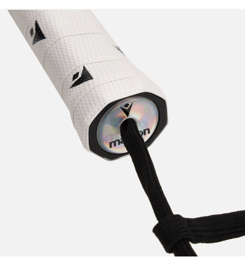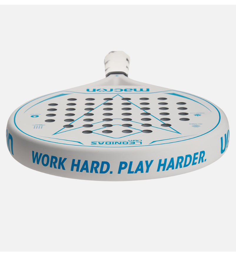 Macron présente la raquette de padel Leonidas Light Racket. Avec un design moderne dans les tons blanc et bleu ciel, elle a été conçue pour les joueurs réguliers qui souhaitent avoir une raquette performante mais avec un poids moindre pour davantage de confort. C'est une raquette qui garantit à la fois la puissance et le contrôle des coups. Entièrement fabriquée en fibre de carbone 3K avec un noyau en mousse EVA ultra soft, elle permet au joueur de la manier avec beaucoup de légèreté. La forme ronde permet d'avoir un sweet pot central pour garantir un contrôle maximal. Le dessin représente le Macron Hero au centre et la mention ' Work Hard. Play Harder. ', devise de Macron, est inscrite sur le bord. La raquette pèse entre 335 et 355 g.