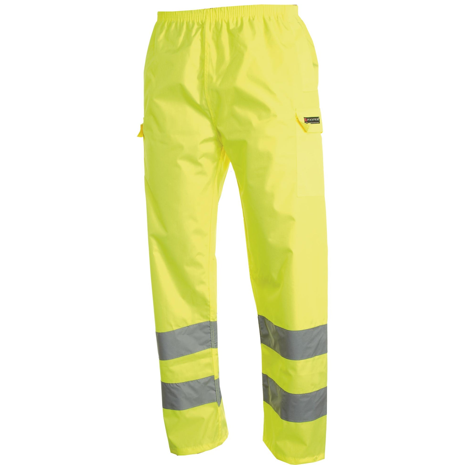 Pantalon anti-pluie à haute visibilité avec bande 3M, élastique à la taille, deux poches enveloppe latérales avec boutons, bas des jambes réglable par bouton-pression, coutures thermosoudées.