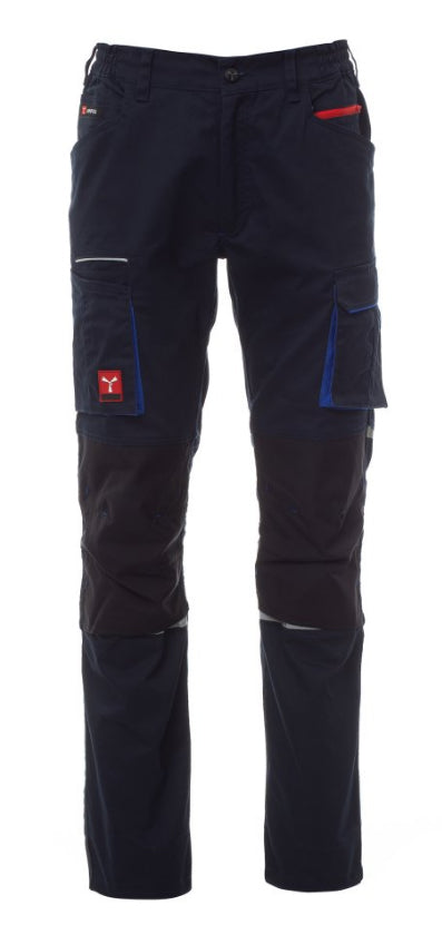 Pantalon unisexe, stretch, multi-saison, à élastiques latéraux et passants à la taille, fermeture à zip et bouton personnalisé. Doté sur le devant de deux poches profilées, une petite poche porte-monnaie à droite, une petite poche de sécurité fermée par zip à gauche. L'avant de la jambe gauche comporte une poche à soufflet avec rabat fermé par velcro et un porte-badge. L'avant de la jambe droite comporte : une poche porte-téléphone à liseré rétroréfléchissant et une poche à soufflet. Les deux jambes sont dotées de porte-genouillères en nylon Oxford 500D, (à ouverture par le bas) et d'inserts rétroréfléchissants indiquant l'ouverture. L'arrière comporte : une poche à rabat fermée par velcro et une poche sans rabat pourvue de 2 bandes rétroréfléchissantes, une poche porte-mètre (jambe droite), des inserts rétroréfléchissants au niveau du genou (sur les deux jambes), talonnette en tissu en contraste (sur les deux jambes). Le vêtement est également doté de : - coutures à triple aiguilles sur l'entrejambe, l'intérieur et l'extérieur jambe - baguettes de renfort en contraste en plusieurs points.
