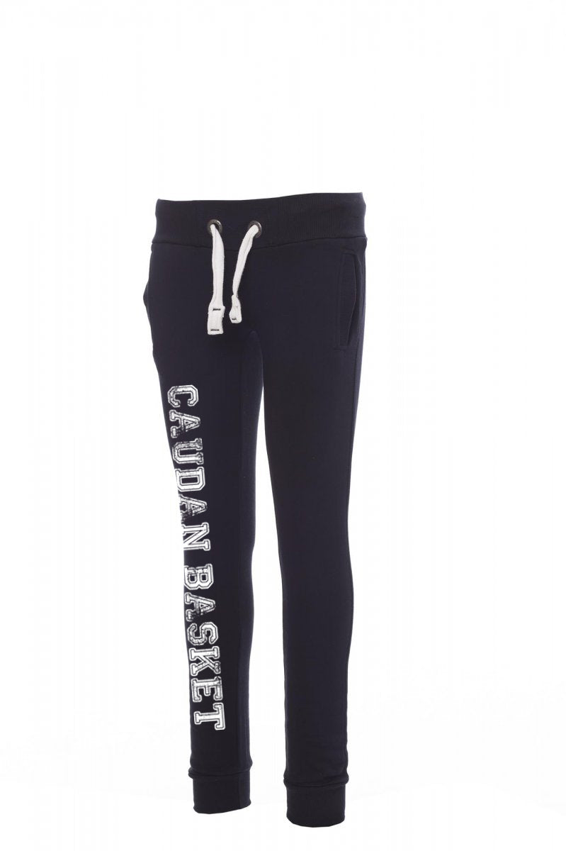 Pantalon en sweat pour femme avec bord côtes élastique à la taille et au bas des jambes, coulisse avec cordon blanc à coutures en contraste et anneaux en métal, deux poches sur le devant avec bord côtes et coutures renforcées.