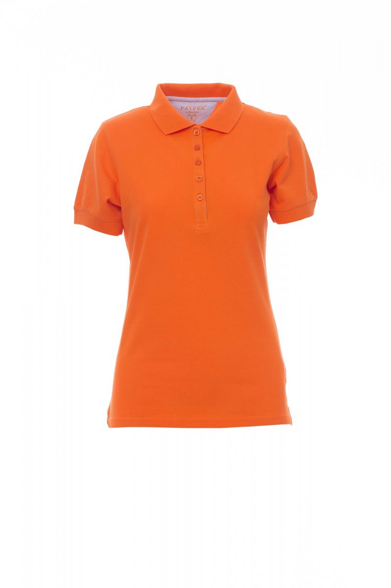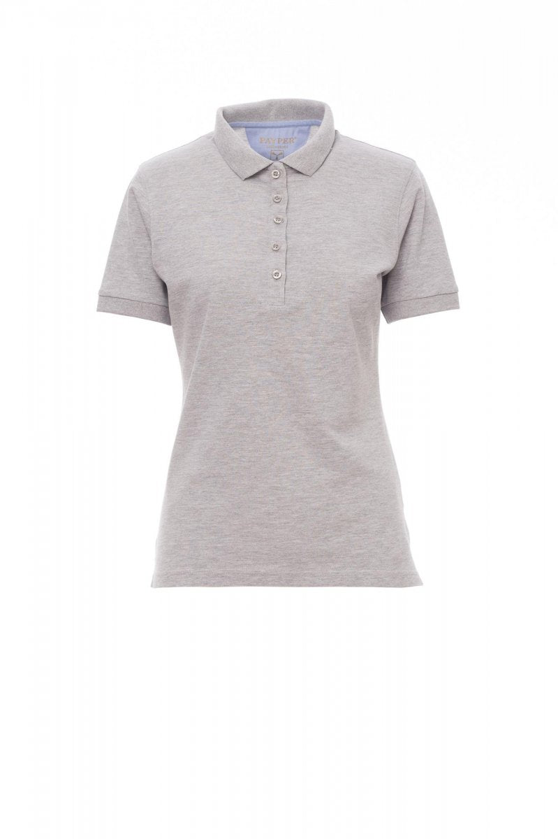Polo cintré pour femme à manches courtes et 5 boutons assortis effet perlé, col et bordure des manches en bord côtes, fins inserts en popeline bleu ciel à l'intérieur du col, ouverture et fentes latérales, étiquette transfert, renfort profilé sur encolure arrière