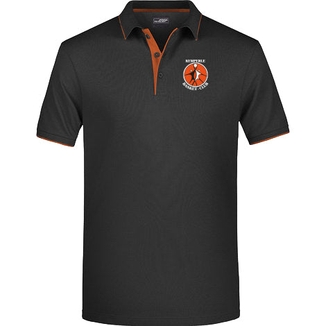 Polo disponible en modèle femme ou homme, noir et orange, logo club inclus.