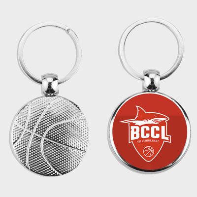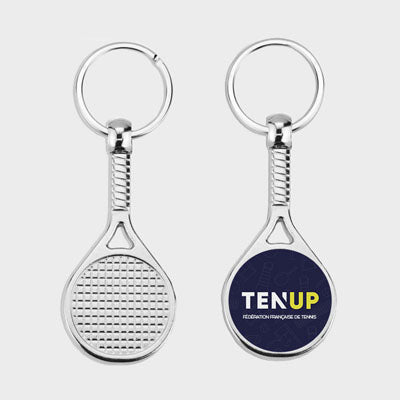 Porte clé en métal, recto visuel quadri personnalisé, verso sport au choix.