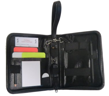 Sacoche d'arbitre comprenant : - 1 carton rouge - 1 carton jaune - 1 carton blanc - 1 carnet de 15 cartes arbitrage foot - 1 bloc neutre - 1 sifflet avec cordon - 1 sifflet seul - 1 jetons à 2 faces - 1 crayon à papier - 1 stylo à bille, le tout dans une sacoche avec plusieurs compartiments et une fermeture éclair.