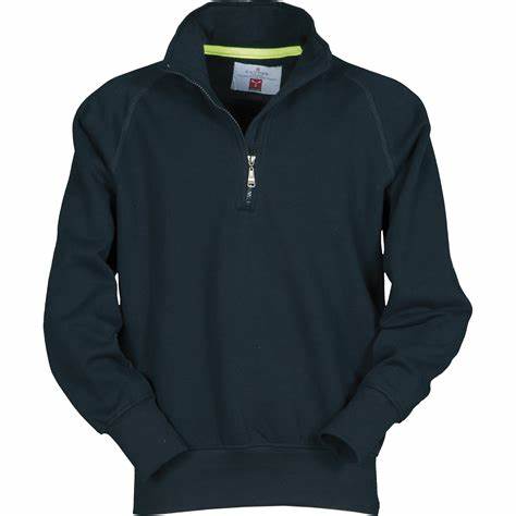 Sweat-shirt pour enfant à demi-Zip de métal, manchette et taille en bord côte élastique, double couture au col, aux manches et sur la taille et ruban de renfort au col.
