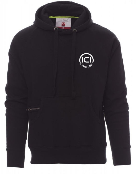 Sweat-shirt homme avec capuche à deux coutures et coulisse en cordon blanc à coutures teinte assortie et anneaux en métal . Manches raglan, couture esthétique en V au col, poches kangourou, petite poche zippée, poignets et taille en côtes élastiques, coutures renforcées, logo coeur inclus.