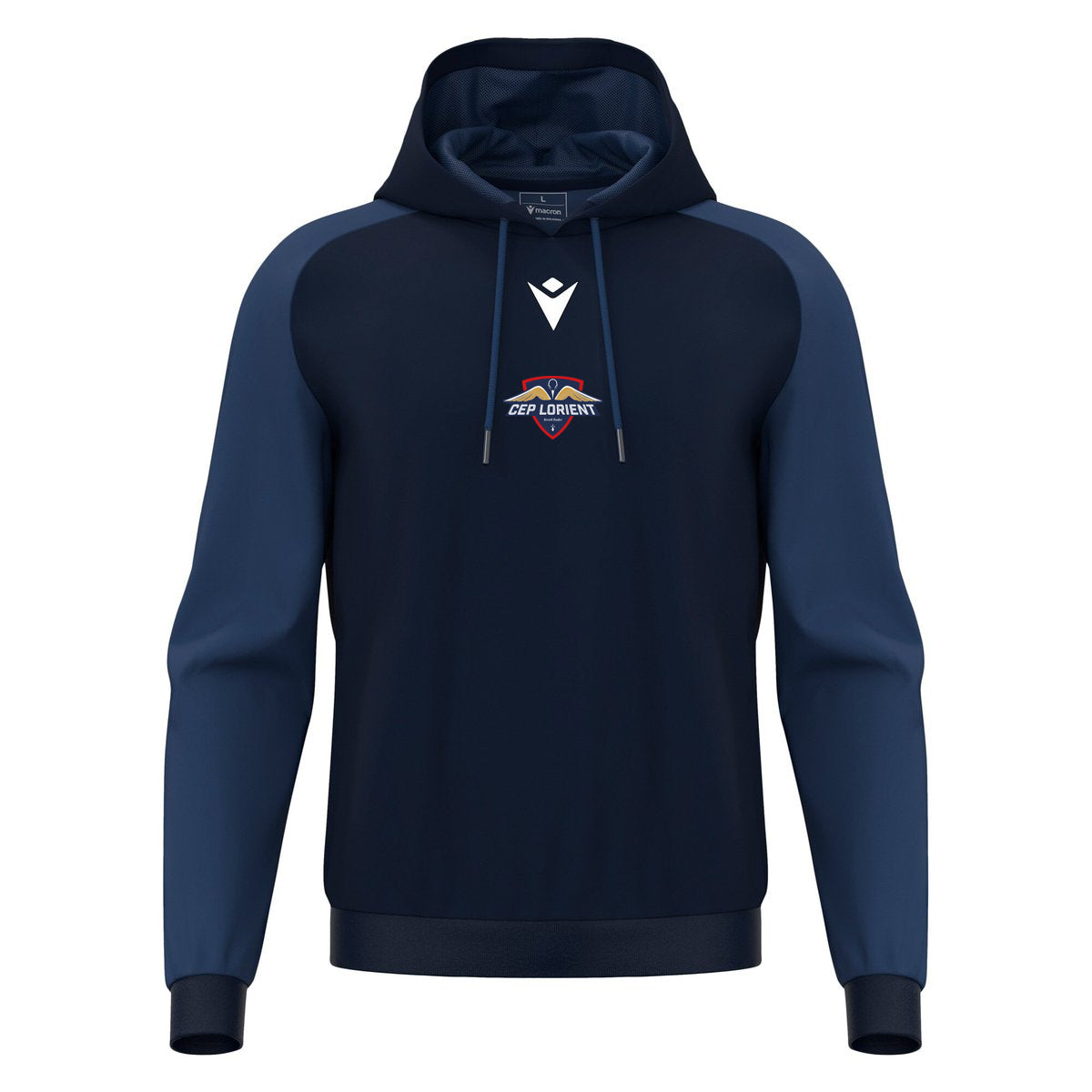 Sweat à capuche HORN Macron, bleu marine, logo club inclus.