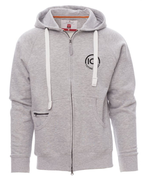Sweat-shirt homme, full zip SBS couvert en plastique avec double curseur en métal . Capuche à deux coutures et coulisse en corde blanche avec coutures en teinte assortie et anneaux en métal . Manches raglan, poches kangourou avec petite poche zippée, poignets et taille en côtes élastiques. Coutures renforcées.