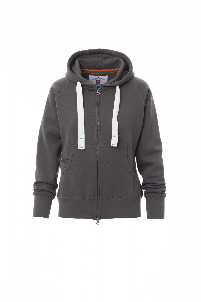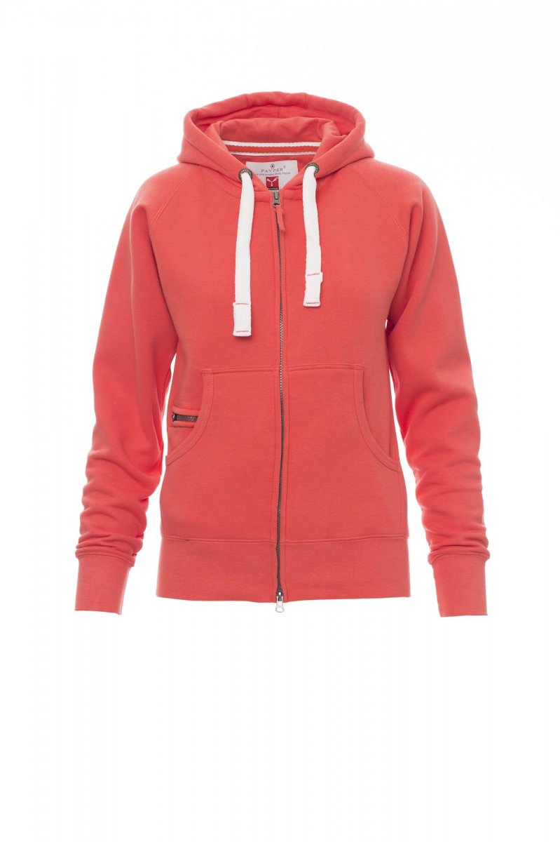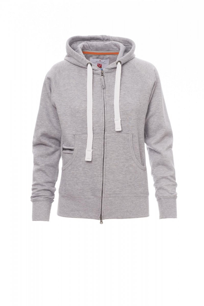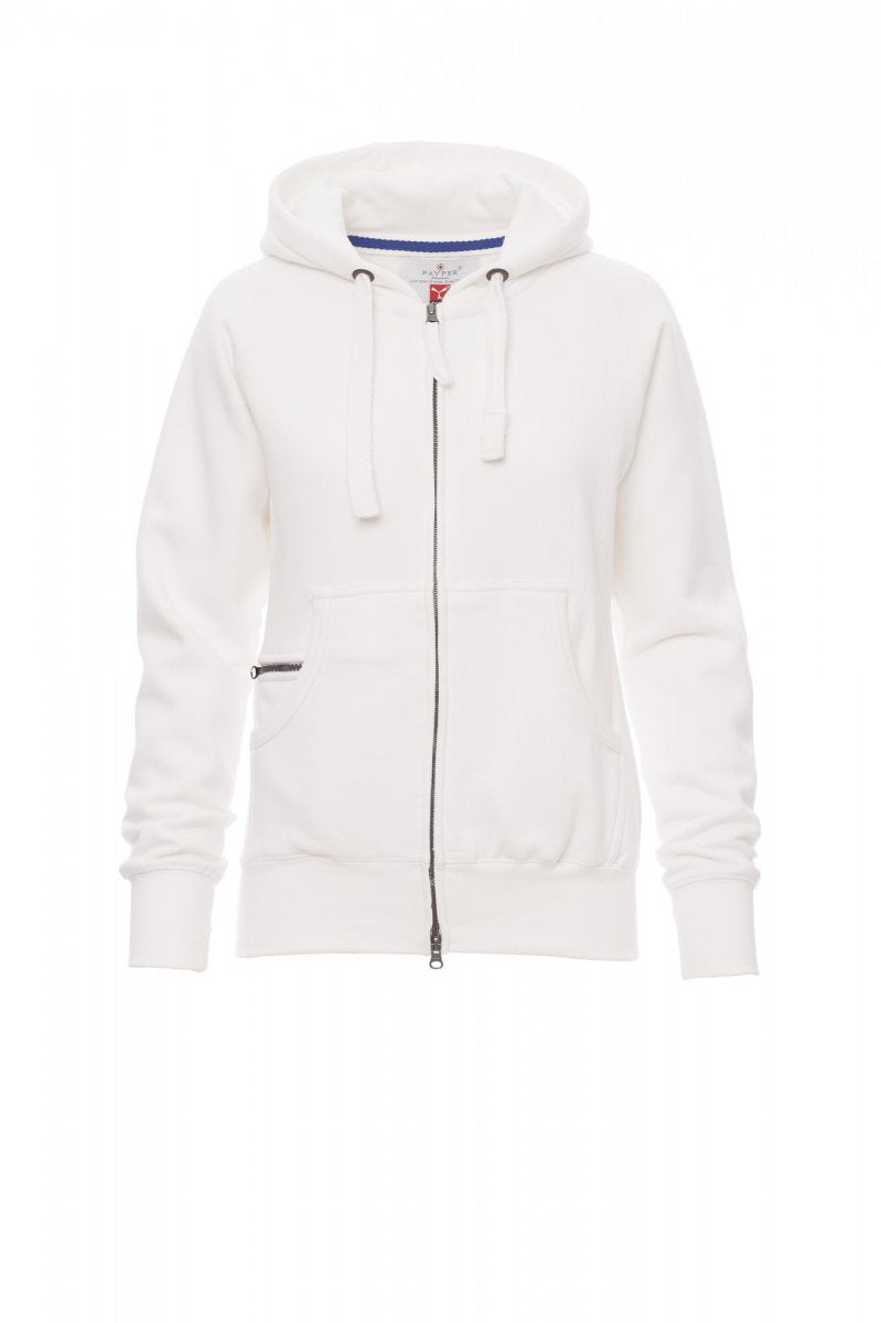 Sweat-shirt femme, coupe cintrée, full zip SBS couvert, en plastique et avec double curseur en métal . Capuche à deux coutures, coulisse en cordon blanc à coutures teinte assortie et anneaux en métal . Manches raglan, poches kangourou avec petite poche zippée, poignets et taille en côtes élastiques. Coutures renforcées.