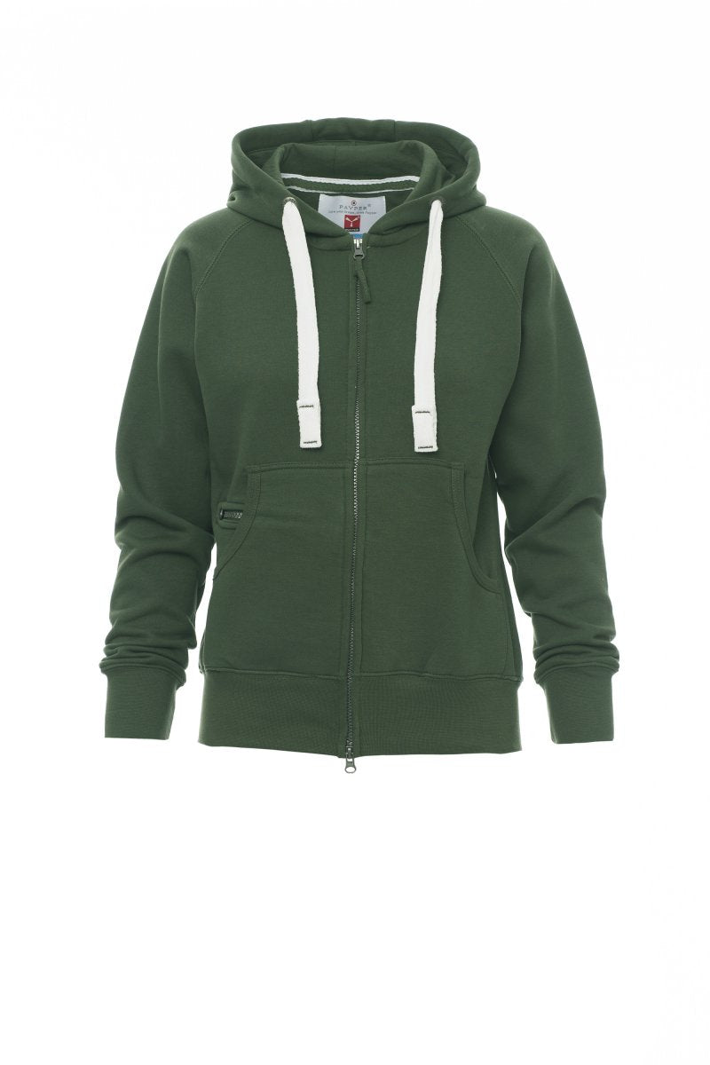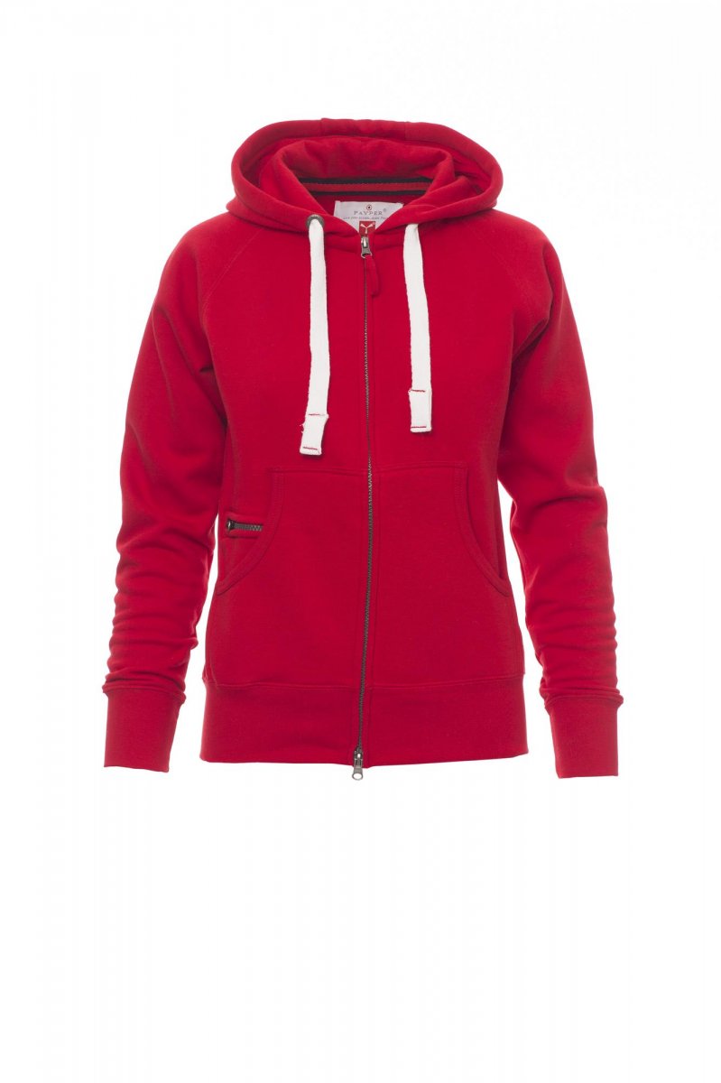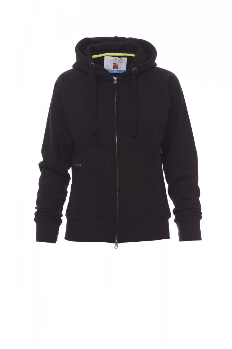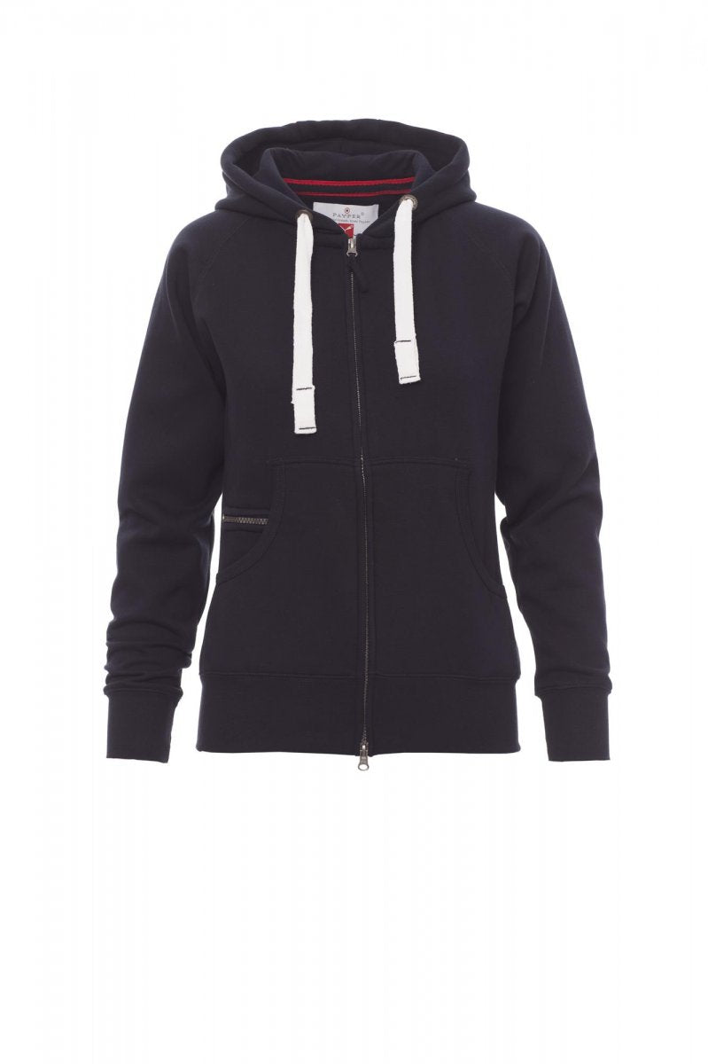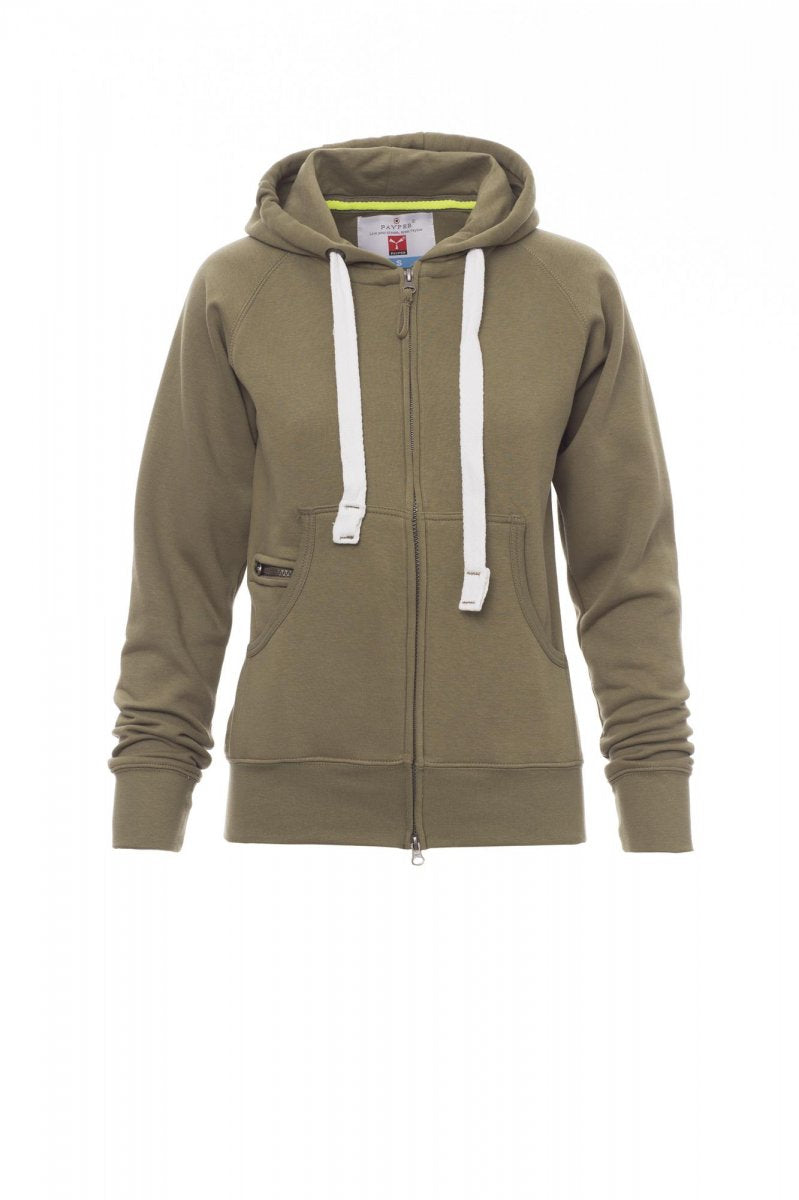 Sweat-shirt femme, coupe cintrée, full zip SBS couvert, en plastique et avec double curseur en métal . Capuche à deux coutures, coulisse en cordon blanc à coutures teinte assortie et anneaux en métal . Manches raglan, poches kangourou avec petite poche zippée, poignets et taille en côtes élastiques. Coutures renforcées.