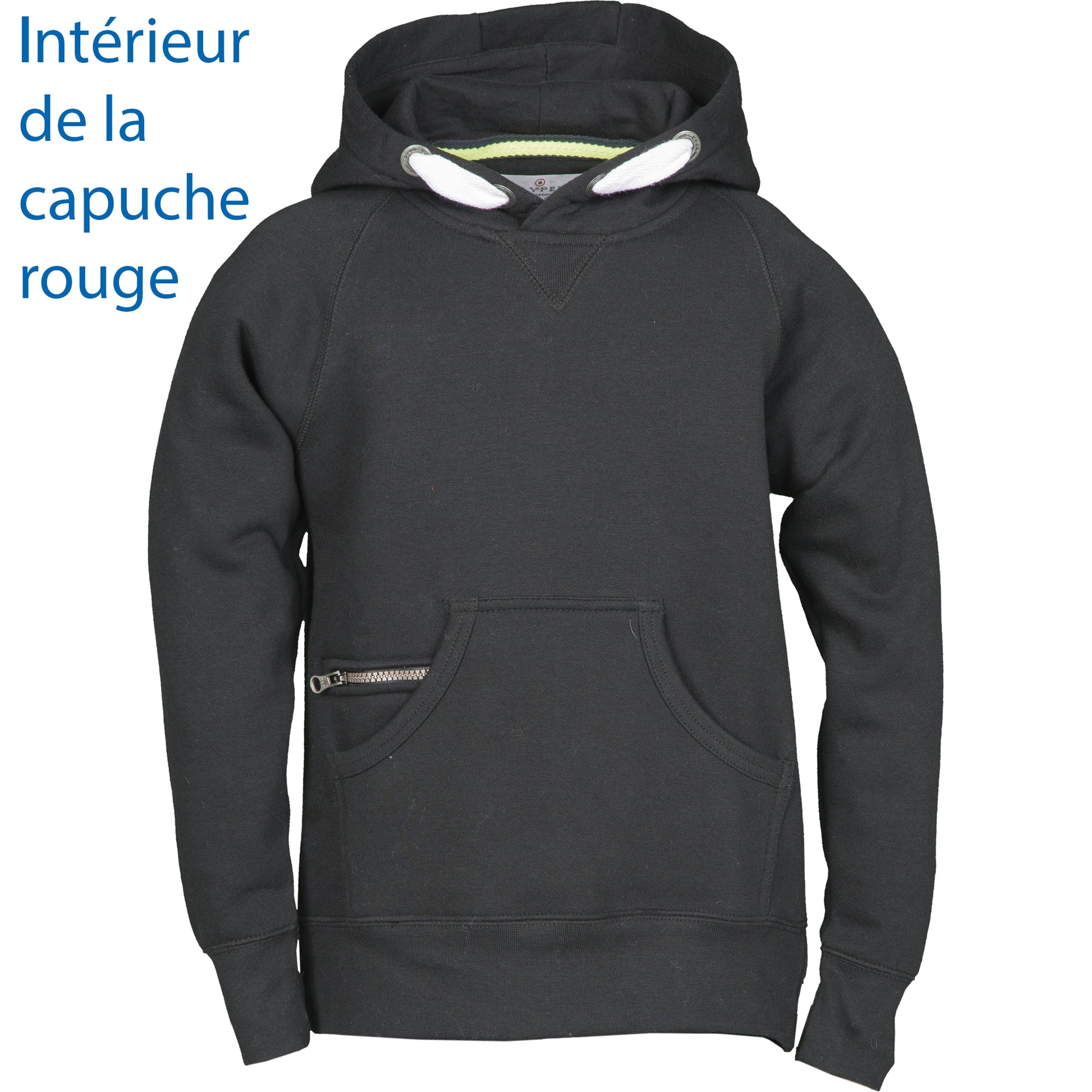 - Sweat noir, intérieur capuche rouge