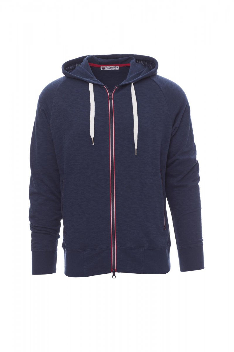 Sweat-shirt pour homme à zip intégral en nylon contrasté, manches raglan, capuche et cordon coulissé de couleur en contraste, ruban intérieur col en contraste, poignets et taille en bord côtes élastique et deux poches avec zip sur le devant.