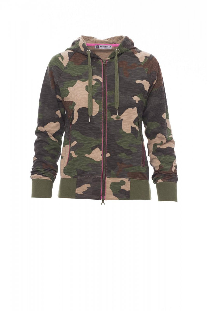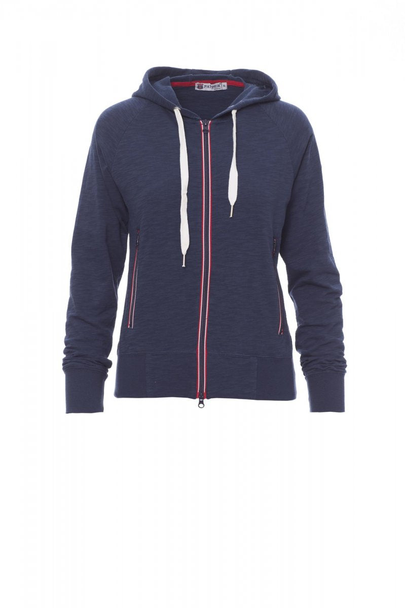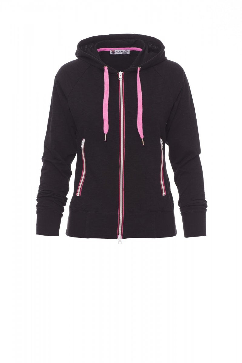 Sweat-shirt cintré pour femme à zip intégral en nylon contrasté, manches raglan, capuche et cordon coulissé de couleur en contraste, ruban intérieur col en contraste, poignets et taille en bord côtes élastique et deux poches avec zip sur le devant.