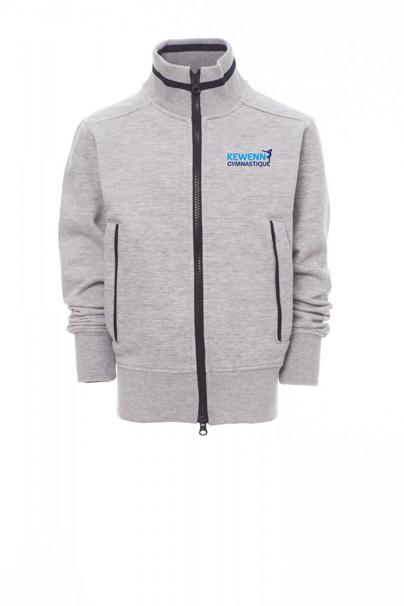 Sweat-shirt enfant, full zip SBS en plastique contrasté, avec double curseur en métal. Col en bord-côte avec liseré contrasté, repris sur les poches latérales . Manches montées, deux poches extérieures avec zip contrasté, poignets et taille en côtes élastiques. Coutures renforcées.