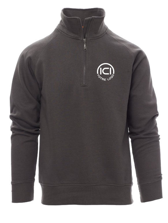 Sweat-shirt à demi Zip de métal, poignets et taille en bord côte élastique, double couture au col, aux manches et sur la taille et ruban de renfort au col.