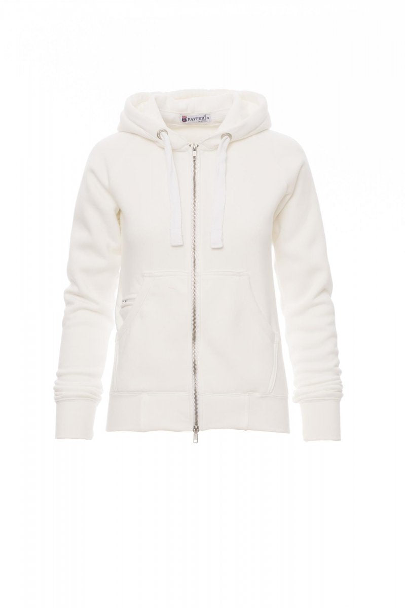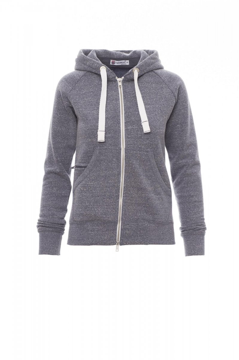 Sweat-shirt cintré pour femme à zip intégral en métal avec double curseur, manches raglan, capuche avec cordon coulissé blanc à coutures assorties au sweat-shirt et anneaux en métal, poches kangourou, petite poche avec zip et prédisposition pour câble mp3/portable, poignets et taille en bord côtes élastique, coutures renforcées. Effet Mélange blanc (noir pour le Bordeaux).