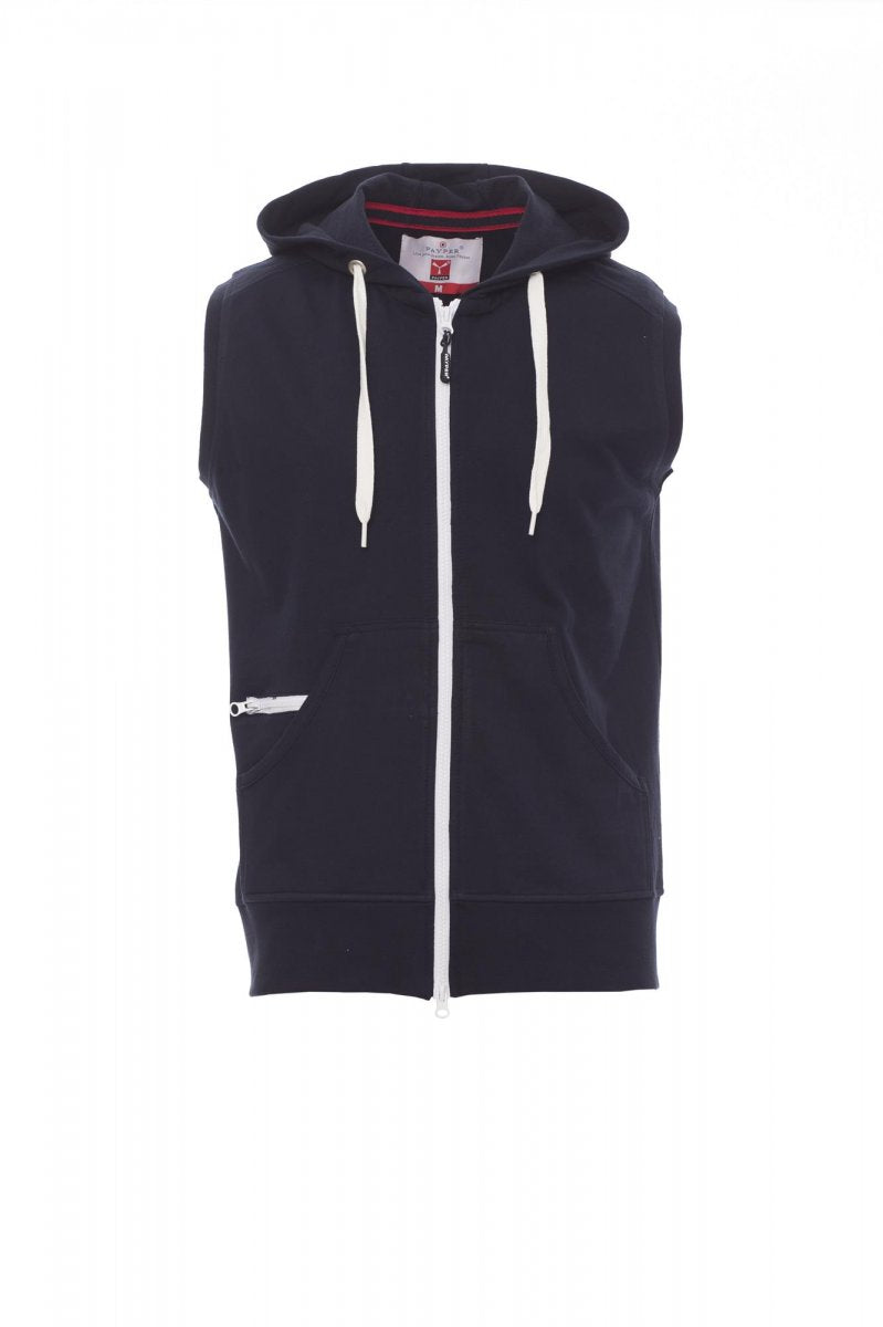 Sweat-shirt sans manches pour homme, zip intégral en plastique, de couleur en contraste, avec double curseur en métal, avec capuche profilée et coulisse en contraste, poches kangourou, petite poche zippée.